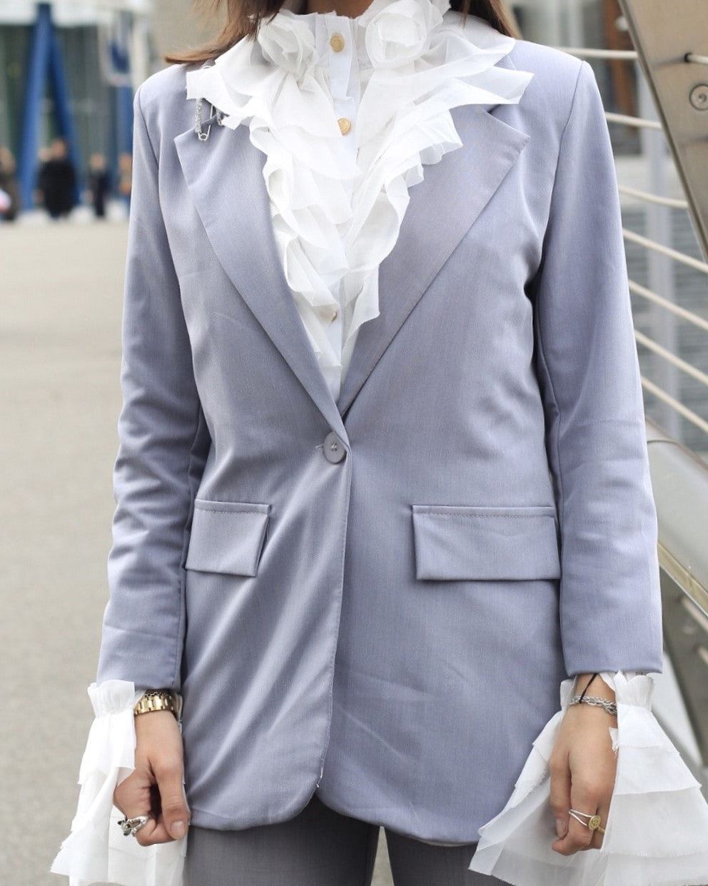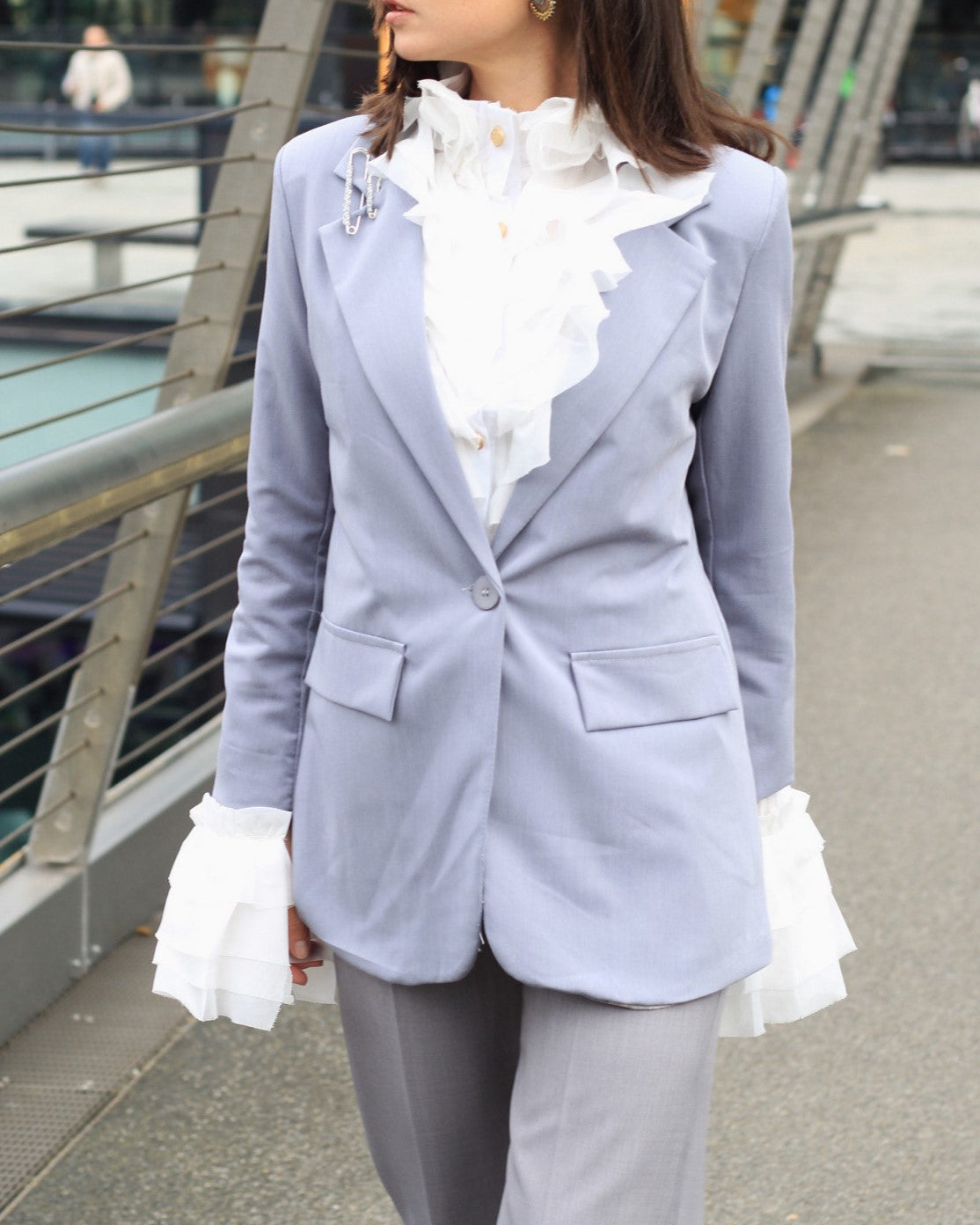 La chiusura con un solo bottone mantiene la linea pulita, mentre la vestibilità regular garantisce comfort e versatilità. Ideale da indossare sia con pantaloni coordinati che per valorizzare un look più informale.